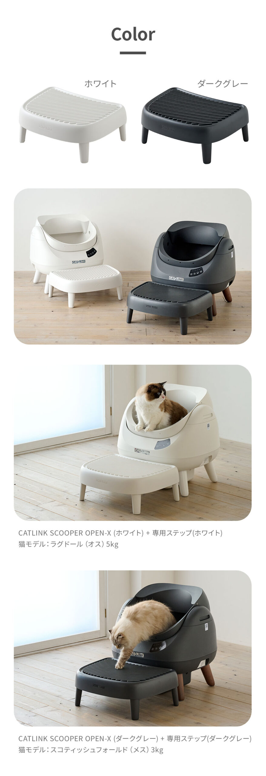 新商品 CATLINK 「CATLINK SCOOPER OPEN-X専用ステップ」が発売されました。 2026年2月9日 本体の前に置くだけで使用でき、工具は不要。ステップを追加することで、トイレ入り口までの動線がスムーズになります。 【CATLINK SCOOPER OPEN-X専用ステップ】 Facebook Twitter